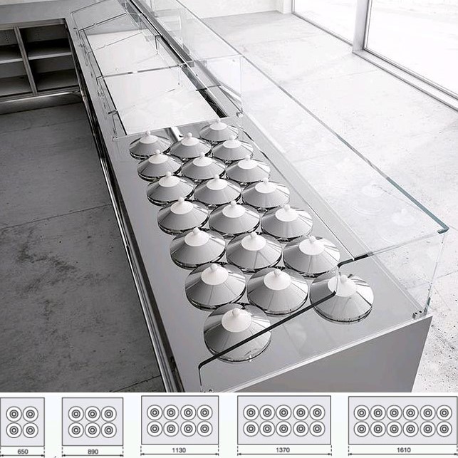 A vitrina MISURA é dotada de um design revolucionário e características técnicas absolutamente inovadoras. Possui regulação e controlo eletrónico da temperatura de -25ºc a + 4ºc, sistema de controle de humidade e máxima ventilação. O seu design foi estudado para favorecer a total visão do gelado exposto. Disponível em vários módulos para qualquer solução desejada.