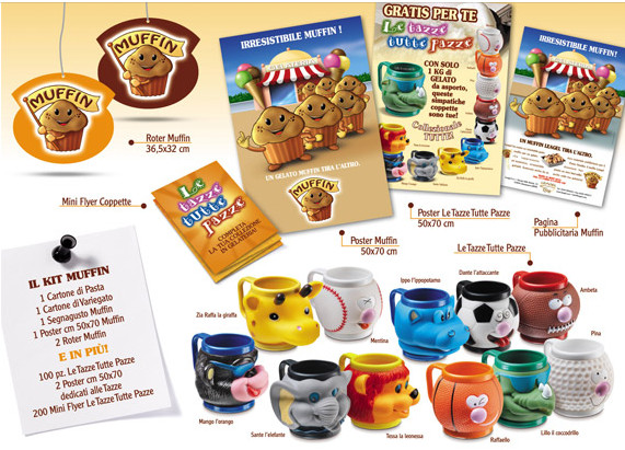 | 402001 | Kit “Muffin e taças tutte pazze” * Composto por 1 ” Kit Muffin” + 100 copos “Le tazze tutte pazze” + 1 poster “Le tazze tutte pazze” + 200 flyer “Le tazze tutte pazze” |
